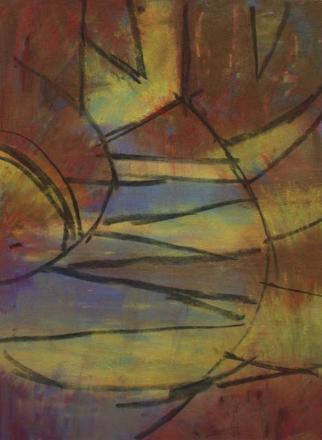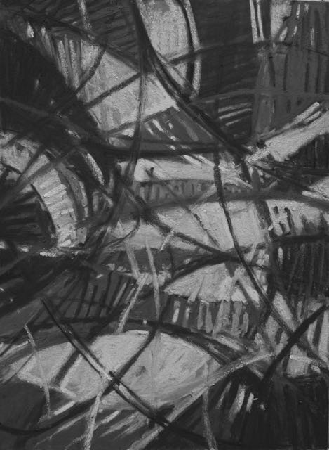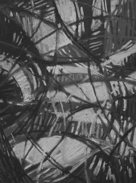 I begin to see light filtering through slats of wood or metal. Like the elevated train platform in Chicago or the Eiffel Tower. With this idea in mind, I continue on. I decide to break up some of the large dark shapes further.