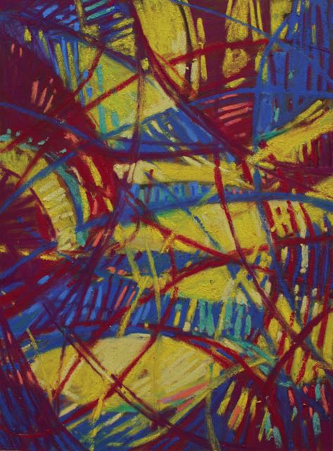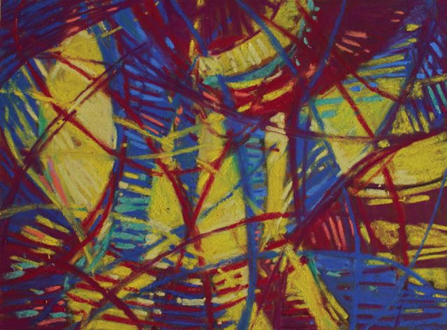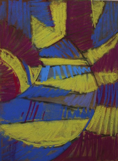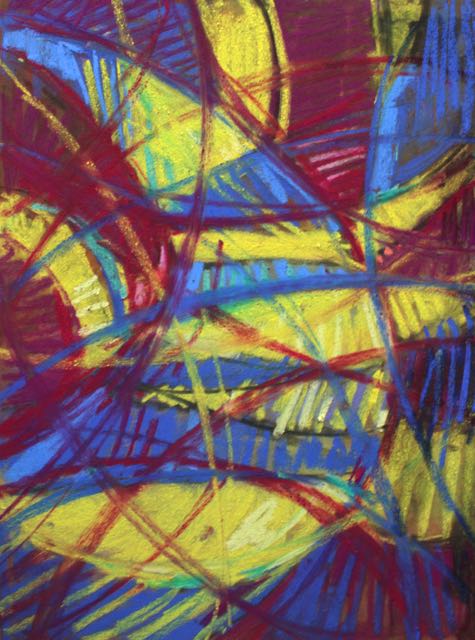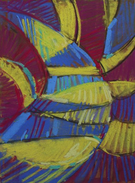 I wonder about drips and add water along one edge. But I discover that drips don’t happen that easily in pastels. (You can see there’s a bit of darkness along the right hand side. That’s wet pastels.) I feel that how I’ve been working, hatching the pastel, has begun to look too much the same. Pretty, I think, and I don’t want pretty. I also feel the big swooping shape takes you right out of the picture. So I decide to introduce long lines across the whole picture plane to stop that movement as well as to add some discomfort to the prettiness. Will it work?