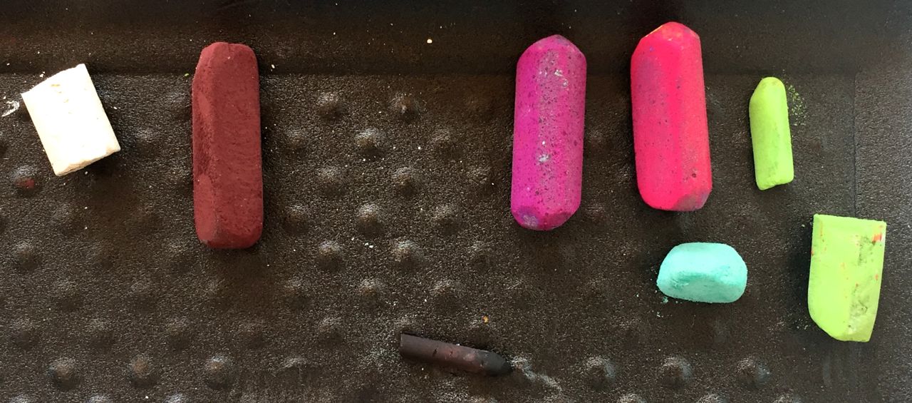 That’s it! At least for now. And here are the pastels I actually ended up using. The pastels on the left are the ones I used most of all followed by the turquoise and orange. I almost didn’t use the very light colour (maybe a yet will!) and I didn’t like the warm brown that I used right at the beginning. So really, I used nine pastels including the two Holbein.