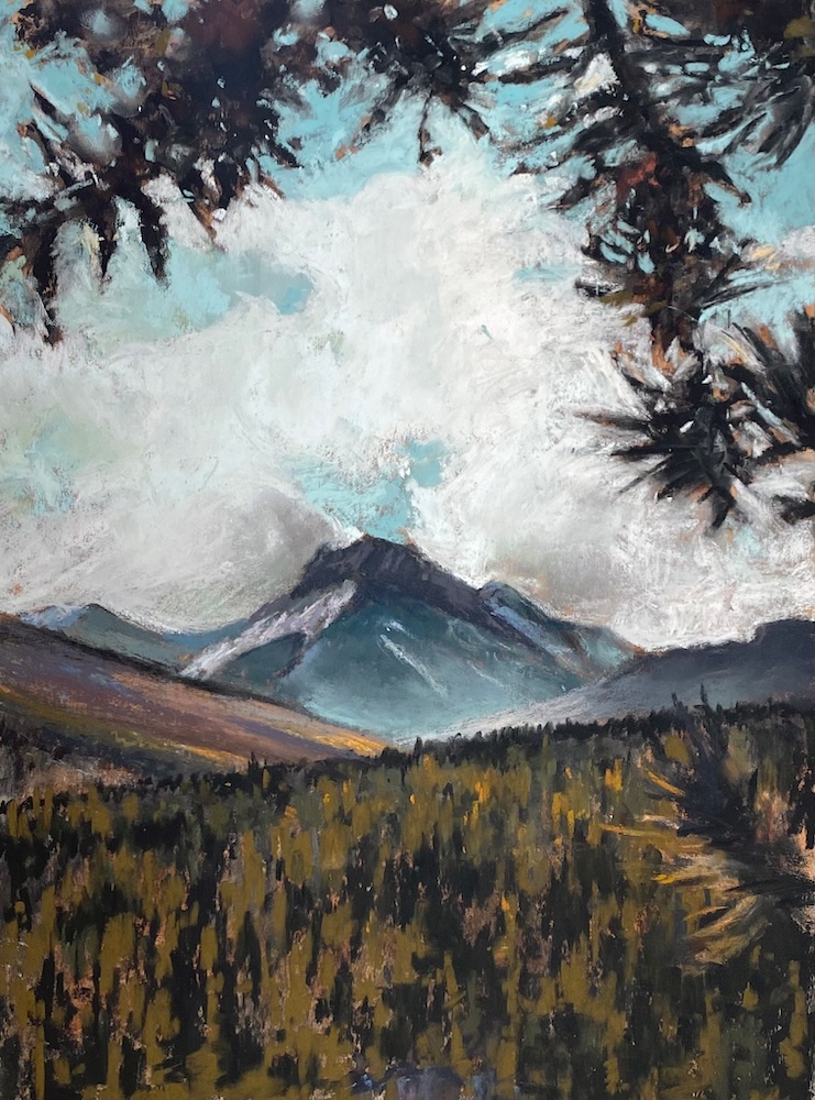 My pastel landscapes begin with a light charcoal drawing, limning the essence of the landscape. Subsequent layering and erasing of pastel bring colour and life and offer suggestions for further exploration. Experimentation ensues by “underpainting” with pastel and then sealing the loosely blocked in pastel shapes with isopropyl alcohol and a brush.