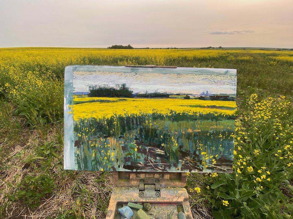 Painting en plein air in mid-summer in the prairies. There’s no shortage of canary yellow fields of canola to inspire.