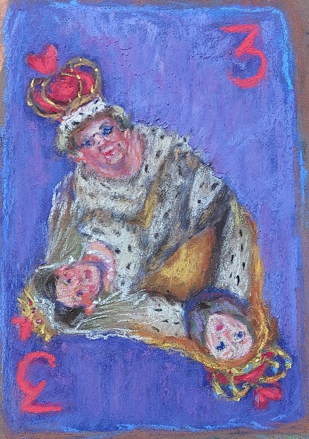 Nicolette van Dam, 3 Three of Hearts, 29 October 2023, Schmincke pastels on Canson Mi-Teintes Touch, 4 ¾ x 4 in. No less than three Queens in the story, so, here they are, tiny faces and all.