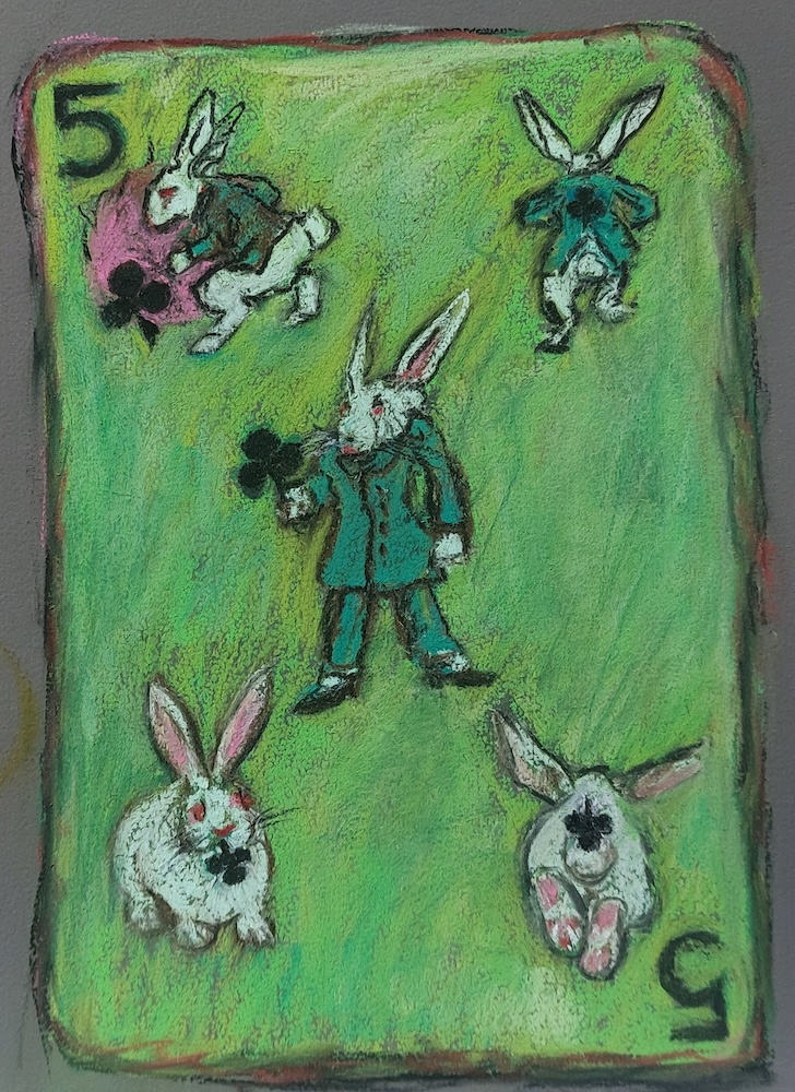 Nicolette van Dam, 5. Five of Clubs, 27 October 2023, Schmincke pastels on Canson Mi-Teintes Touch, 9 x 6 in. On day 26, I had reached the end of the alphabet, but not of my rope, so I continued with numbers – counting down the last few days. Fortunately, Playing-Cards played an important part in the story and this is number 5, Five of Clubs, featuring the famous White Rabbit.