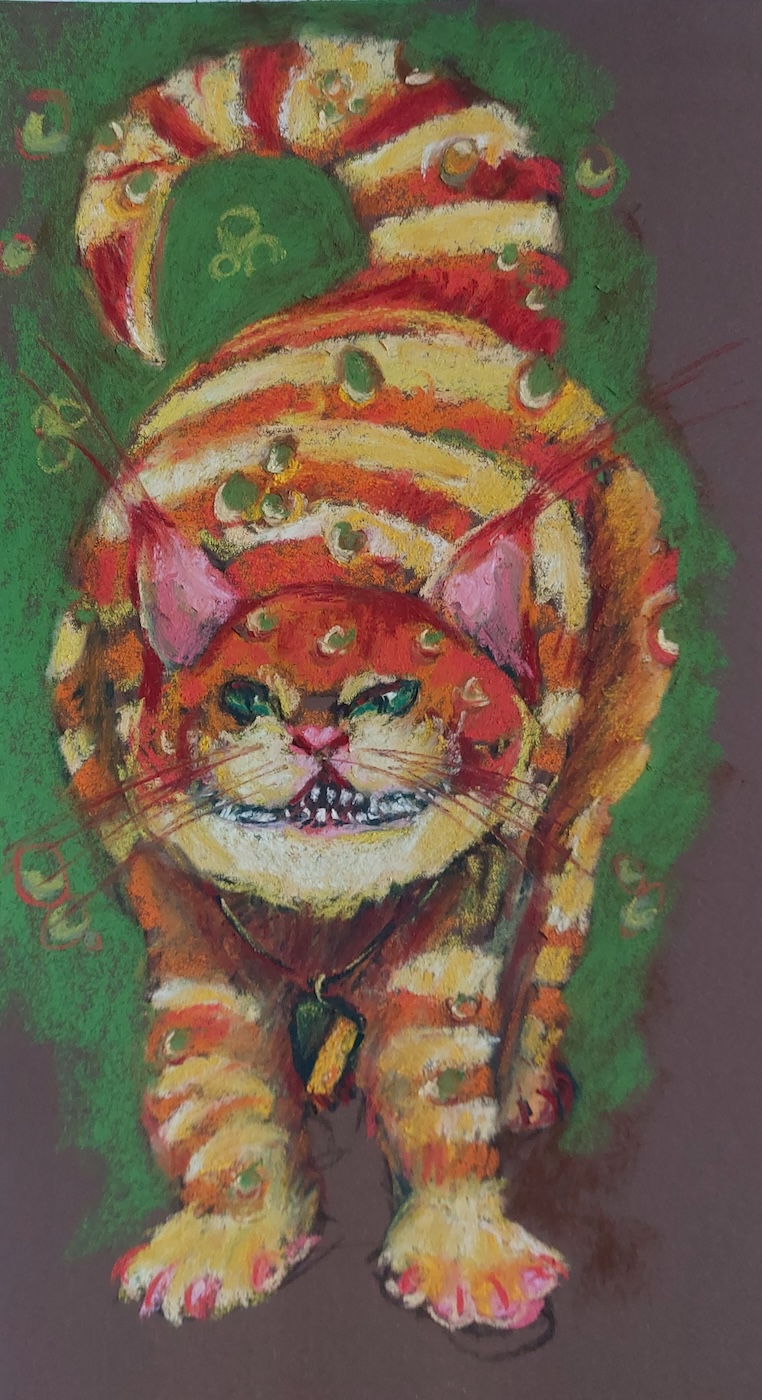 Nicolette van Dam, C. Che(e)shire Cat, 3 October 2023, Schmincke pastels on Canson Mi-Teintes Touch, 15 x 7 1/2 in. The Che(e)shire Cat plays a naughty part in Alice’s Adventures, appearing and disappearing all the time. He grins so much because there is an abundance of dairy products for him in the County of Cheshire.