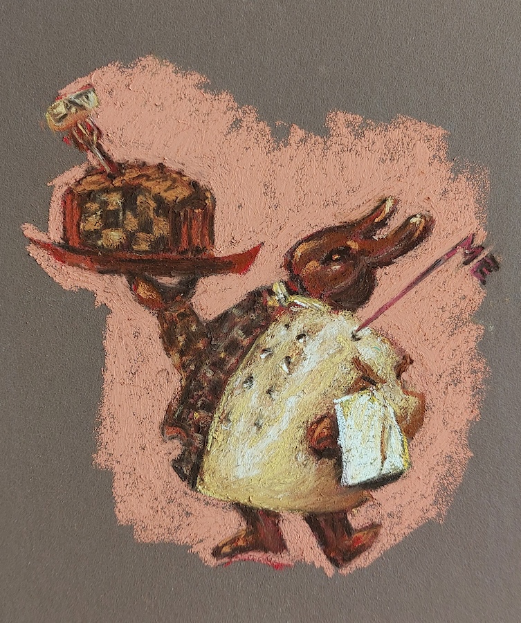 Nicolette van Dam, P. Pig and Pepper, 16 October 2023, Schmincke pastels on Canson Mi-Teintes Touch, 7 ⅜ x 7 ⅜ in. In the Duchess’s kitchen, the cook was shaking clouds of pepper into a large cauldron of soup. The Duchess was cradling a sneezing pink baby in her arms, which a few moments later appeared to be a piglet. Alice set it free in the woods.