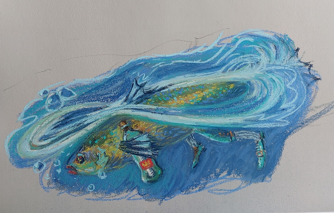Nicolette van Dam, F. Fish Footman, 6 October 2023, Schmincke pastels on Canson Mi-Teintes Touch, 7 ½ x 13 ½ in. The fish Footman with busy fins and feet, carrying a message in a bottle. To be delivered to the ferocious Queen ASAP, if he knew what was good for him.