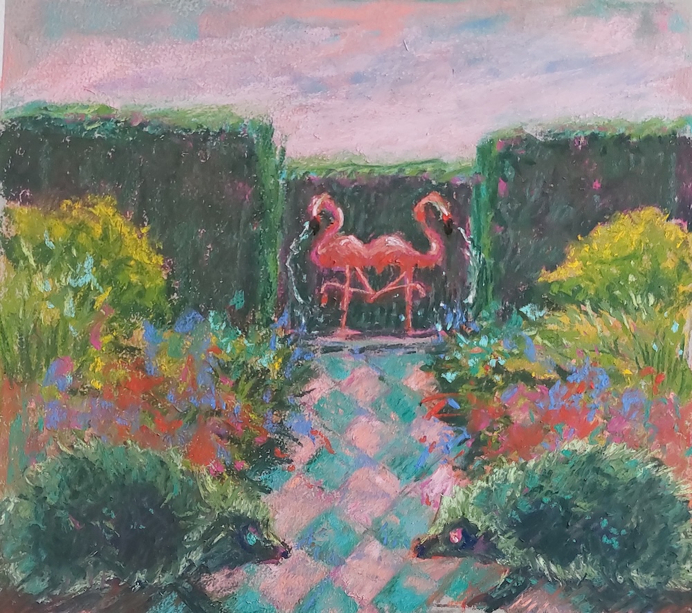 Nicolette van Dam, G. Garden, 7 October 2023, Schmincke pastels on Canson Mi-Teintes Touch, 8 1/2 x 9 1/2 in. The Queen’s Formal Garden. How she adored hedgehogs and flamingos. Capability Brown designed a suitable hedgerow and fountain for her.