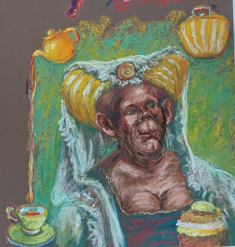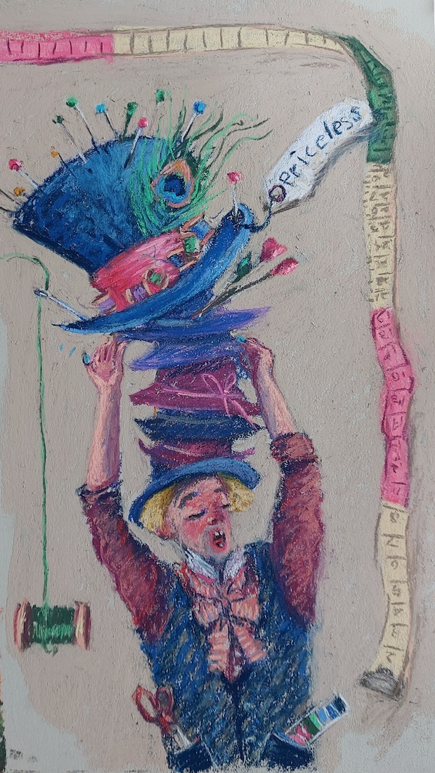 Nicolette van Dam, H. Hatter, 8 October 2023, Schmincke pastels on Canson Mi-Teintes Touch, 13 3/4 x 7 3/4 in. Alice met the scatterbrained Hatter at the mad tea-party.