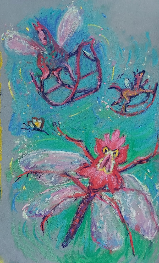 Nicolette van Dam, I. Insects, 9 October 2023, Schmincke pastels on Canson Mi-Teintes Touch, 9 ⅜ x 5 ½ in. The Rocking-Horse-Fly and the Snapdragon-Fly, happily buzzing around in Wonderland and in Carroll’s highly imaginative mind.