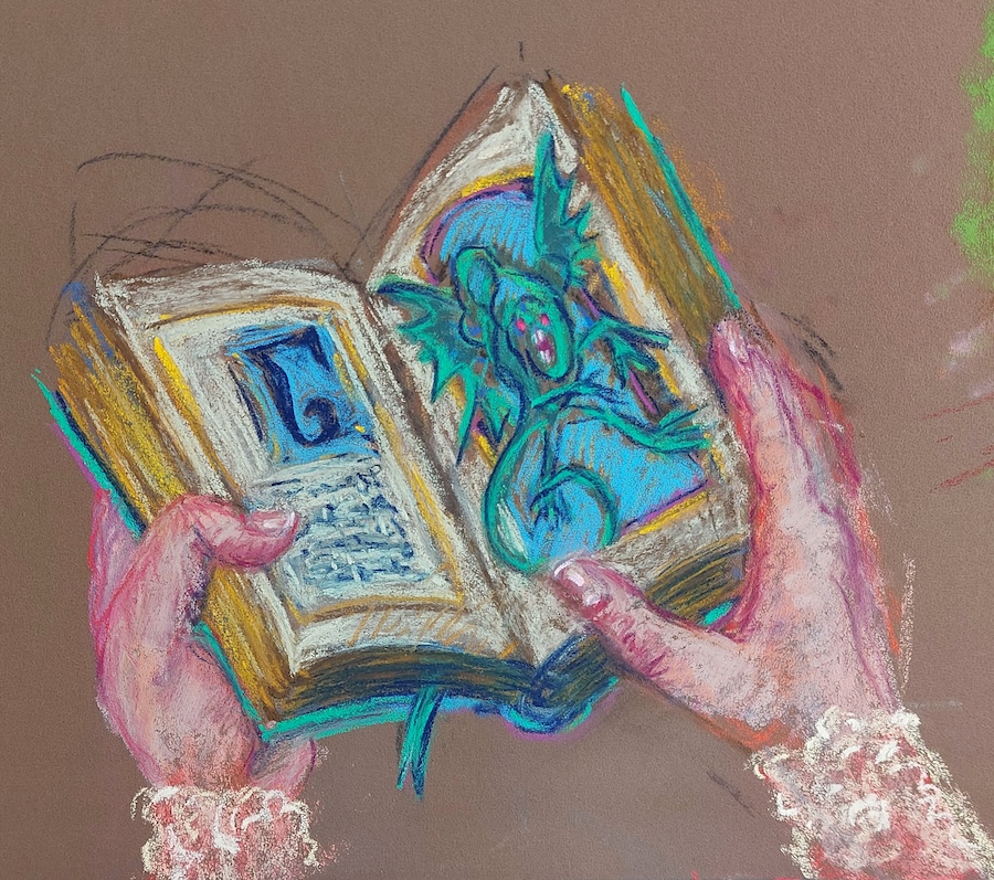 Nicolette van Dam, Y. Yarn, 25 October 2023, Schmincke pastels on Canson Mi-Teintes Touch, 9 x 7 3/4 in. Spinning a long and colourful Yarn is what Lewis Carroll did when he invented his Alice stories.