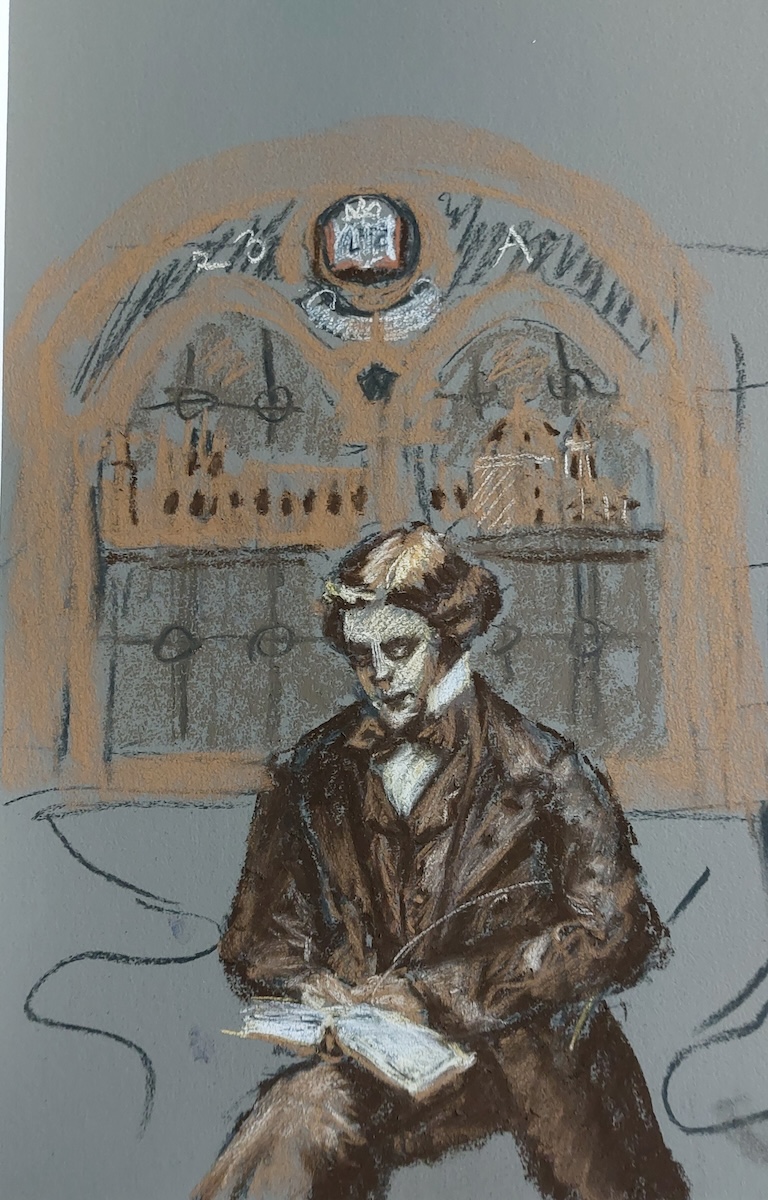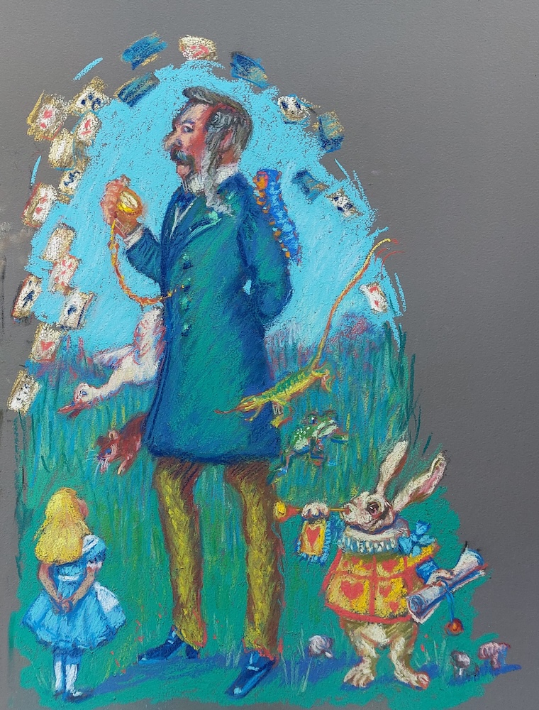 Nicolette van Dam, N. Novelist, 14 October 2023, Schmincke pastels on Canson Mi-Teintes Touch, 11 x 8 9/16 in. A homage to the awesome, multi-talented Lewis Carroll, novelist, poet, mathematics don at Oxford University, a dean of the Anglican Church. This is him at age 24. His Alice stories were a great commercial success right from the start and Alice is still an important part of popular culture.