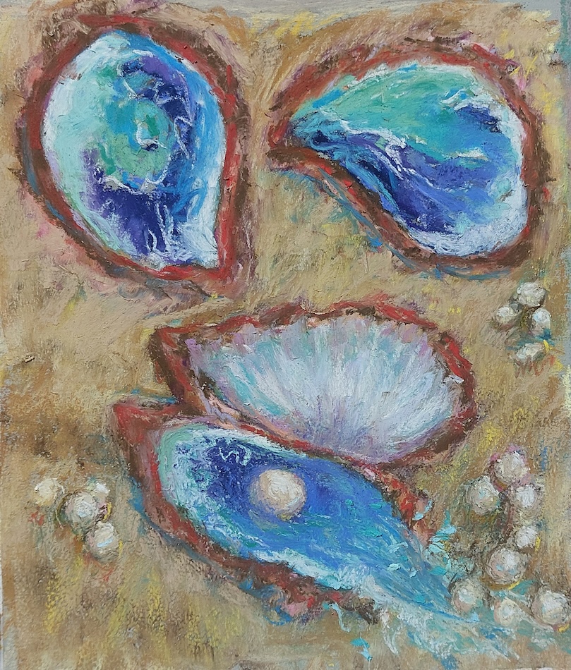 Nicolette van Dam, O. Oysters, 15 October 2023, Schmincke pastels on Canson Mi-Teintes Touch, 8 ⅝ x 6 ⅞ in. The Oysters were eaten by the Walrus and the Carpenter, their pearls and empty clams silent witnesses of the drama.