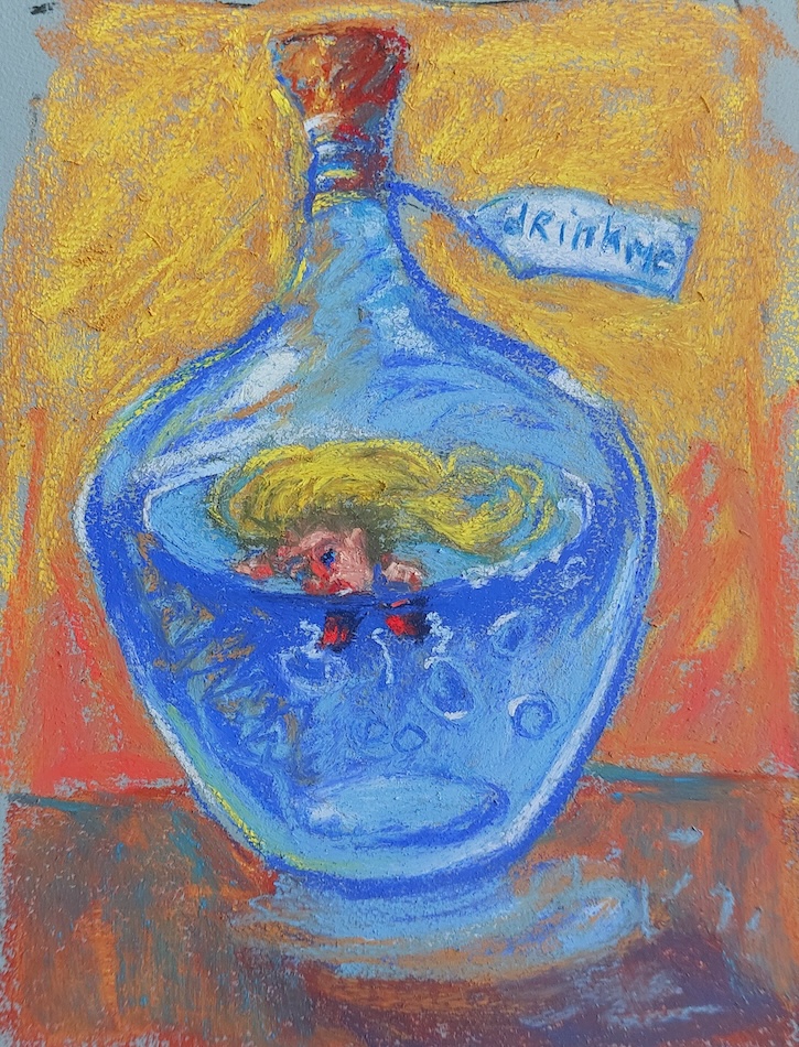 Nicolette van Dam, S. Shrunk, 19 October 2023, Schmincke pastels on Canson Mi-Teintes Touch, 7 x 5 in. This time, Alice had fallen for a bottle containing a beautiful blue liquid, or rather, she had fallen into it, as it turned out the drink would make her Shrink. As a consequence of all this, her body took on a weird shape, losing its mid-section.