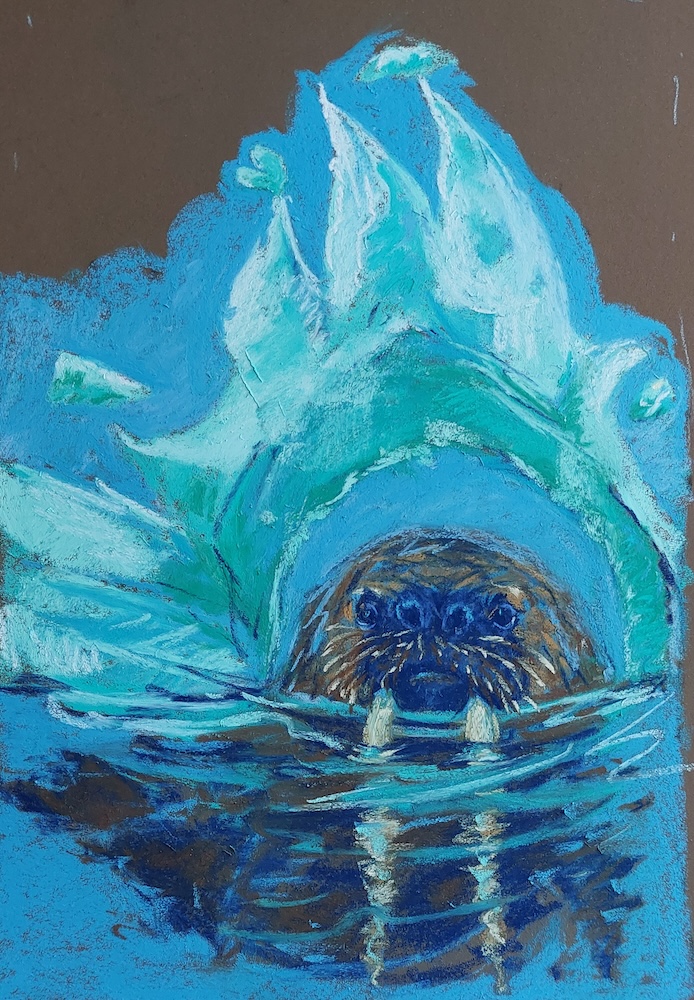 Nicolette van Dam, W. Walrus, 23 October 2023, Schmincke pastels on Canson Mi-Teintes Touch, 12 x 9 in. The Walrus and the Carpenter are said to represent some contemporary political figures of Carroll’s days. They tricked innocent young Oysters into coming with them and then they ate them. This makes it a story about encroachment and entitlement, but my Walrus is just innocently minding his own business in his preferred habitat.