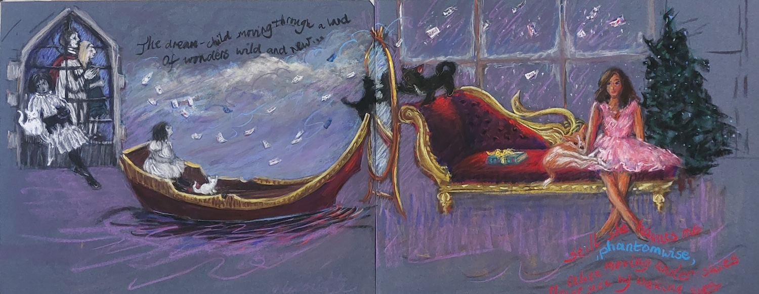 Nicolette van Dam, Waking Up, 31 October 2023, Schmincke pastels, Conte crayons, charcoal, on two sheets of Pastelmat , 9 1/2 x 24 in. The last day of the Challenge did not have a number, but a title : Waking Up. This piece connects past (summer of 1865) and present (Christmas 2023) and represents dream versus reality. On the left, there are three Alice’s : one together with Lewis Carroll in the stained glass window in Carroll’s hometown church, and twice the real Alice. She was Carroll’s 10-year-old neighbour Alice Liddell, his muse. He often went on rowing trips with her and her family. There, he was inspired to write a story about her. And a few poems for the book. In the story, she had both a white and a black kitten, which are mirrored by both my white and black dog. Alice, and I, Woke Up from a month-long adventure when she went through the Looking Glass again and then it appears that she is in fact my lovely daughter Juliette, my muse!