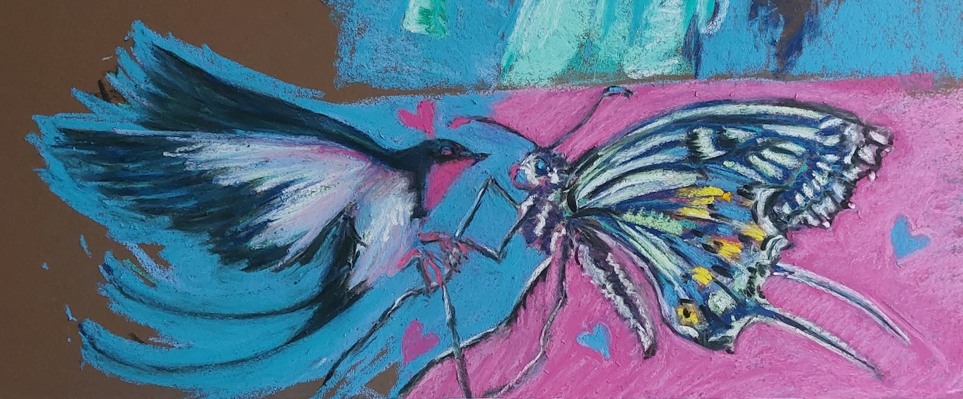 Nicolette van Dam, X. Xuthus, 24 October 2023, Schmincke pastels on Canson Mi-Teintes Touch, 4 ¾ x 13 in. A Xuthus is a Swallowtail butterfly that was no doubt fluttering around the Queen’s flowers. She is courted by a Swift, handsome Swallow. Will they produce little baby fork tails?