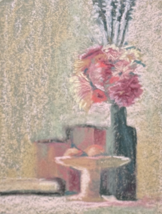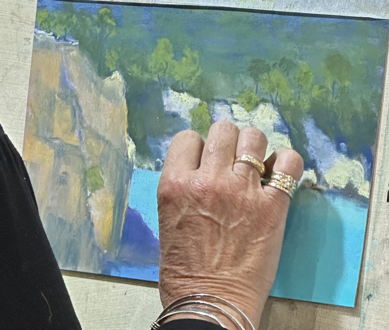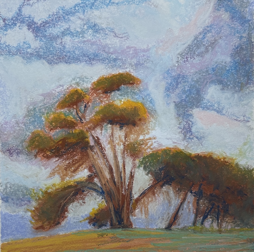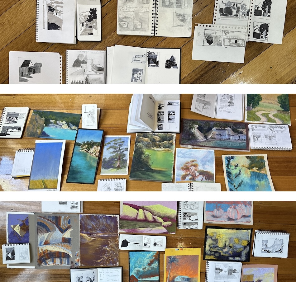 Then there were the results of their efforts – yet more inspiration! What I enjoyed was their amazement at what they’d created, paintings that regularly took them away from their usual way of working (and thinking!). So often their work inspired me because they gave me a different way of looking at a subject, a different way of applying pastel, a different combination of colours. Seriously, I was blown away by the fabulous work they produced in response to their learnings and the beauty of this place.