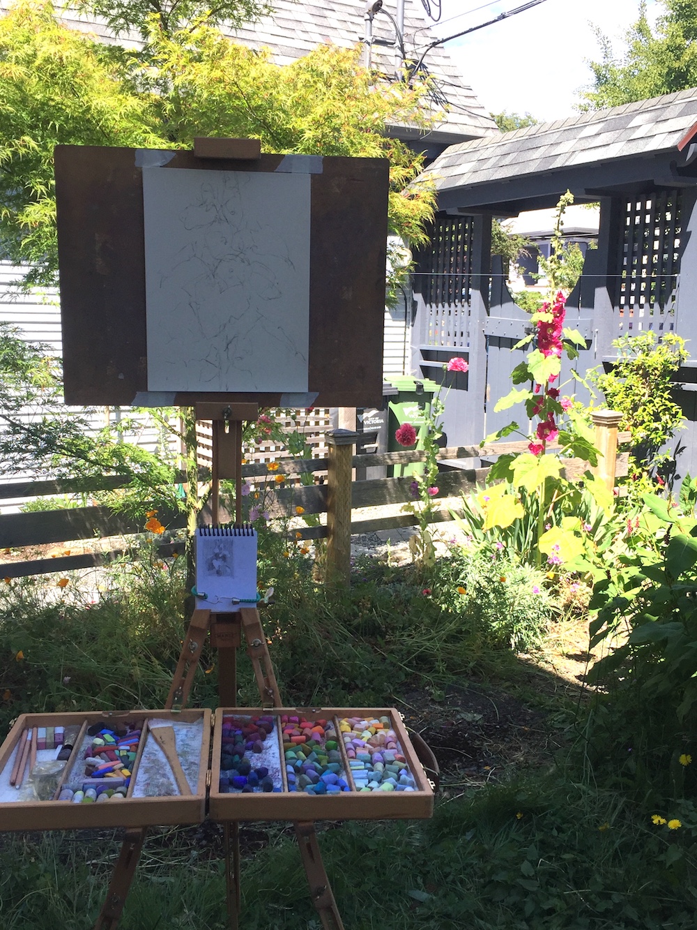 Here’s a photo of the hollyhocks and my easel set up in the backyard.