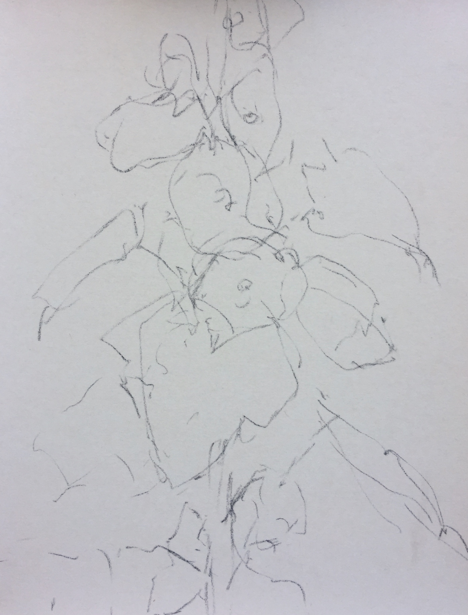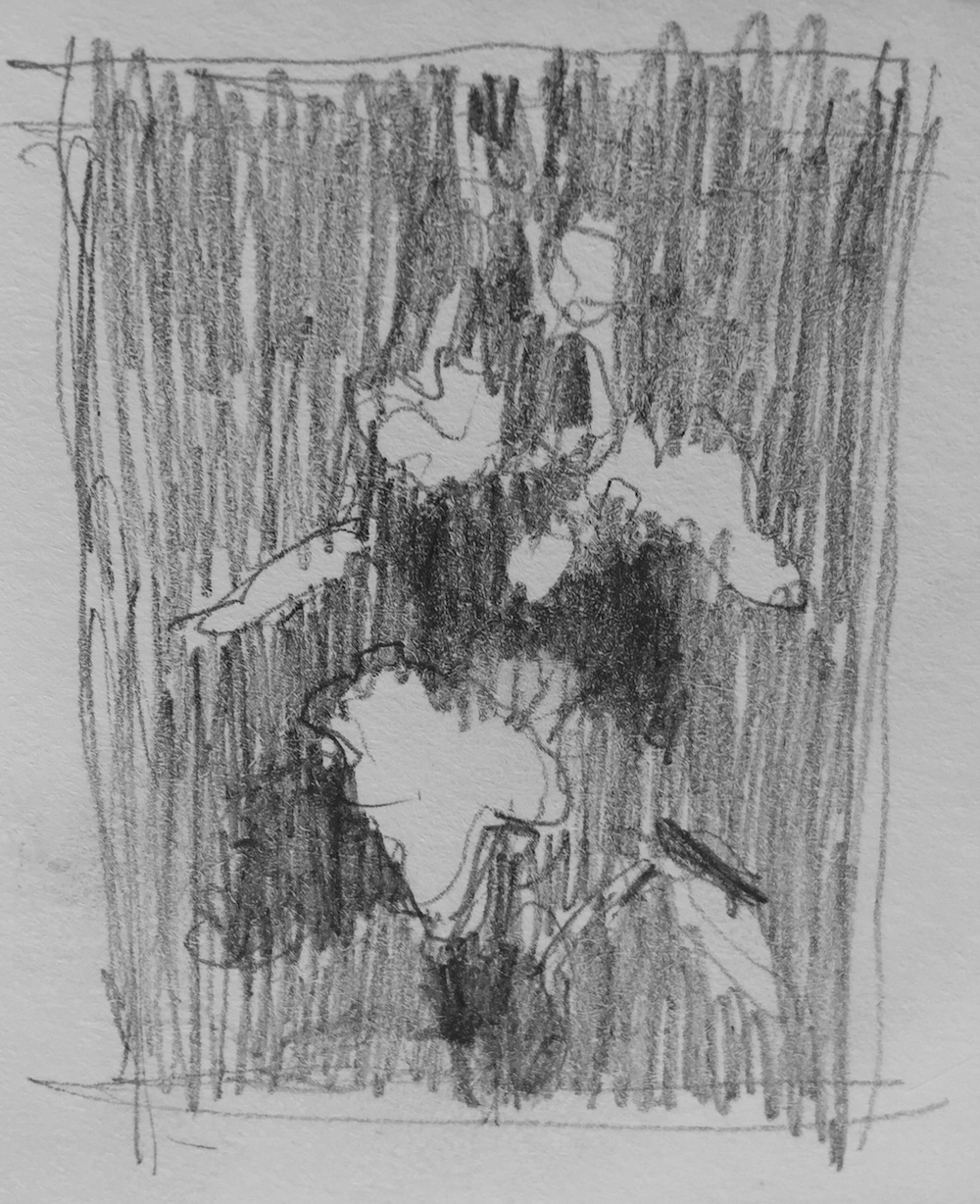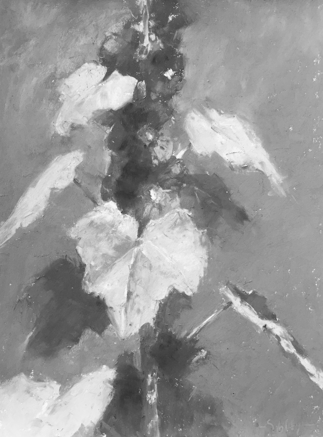 Cam and I had both commented on the delicious beauty of a surprise stalk of hollyhocks. As I contemplated backyard plein air painting, I thought of them. So I had a look to see if they’d fit the painting bill. And yes! there was a lovely pattern of light and shade very easily divided into three values. Since I only had an hour and thought it wise not to complicate things too much, the hollyhocks were a wonderful subject.
