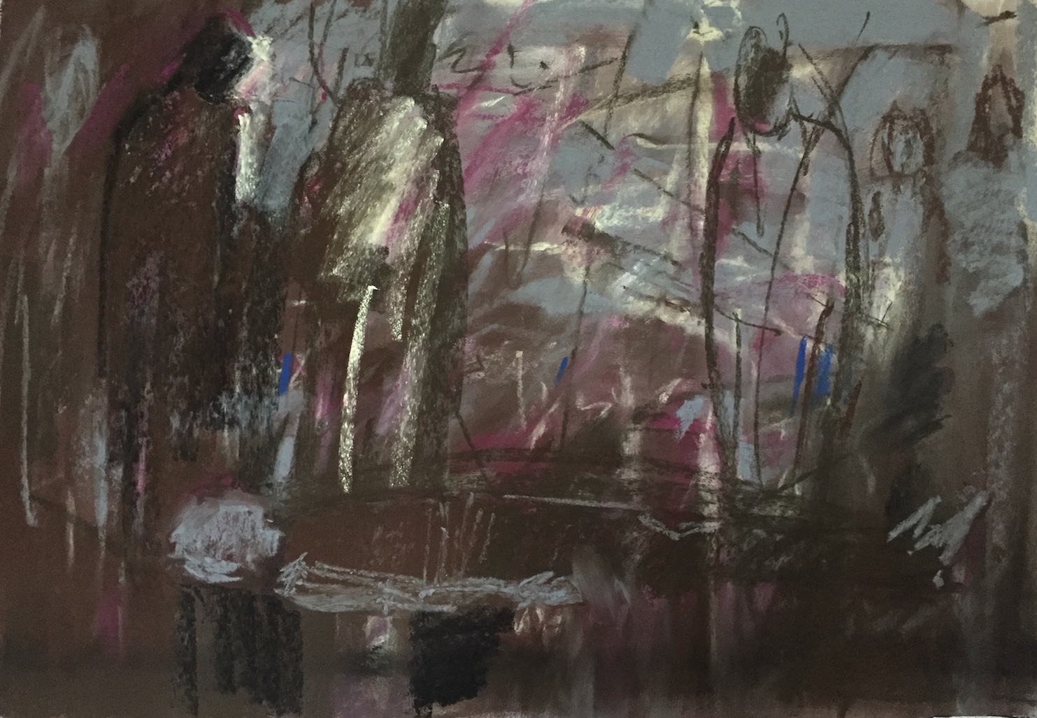 But at the same time, I pondered meaning. How was I to make meaning from this essentially non-objective piece? And then out of nowhere came an image of grieving figures. So I surrendered and began adding them, changing the work towards a more representational image.