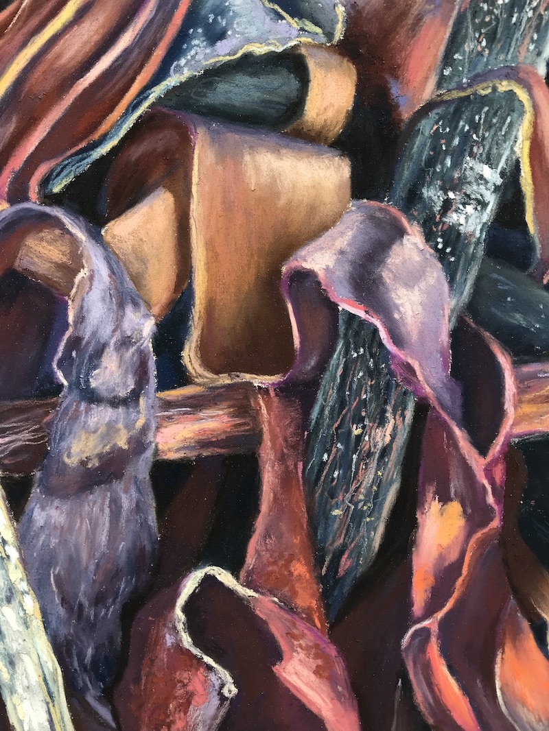 Inspiration for me often comes from the natural world and discoveries when out walking or running. One day, I spotted the light shining on some Honesty seeds by the roadside, and was immediately transported back 30 years to my Mother’s house. She always had a vase of these pretty seeds and the associations of warmth and childhood saw me return later with a pair of scissors to snip a few bunches and bring them home to arrange in a vase, as my Mother had. It was not long before I decided to light them and explore their beautiful textures with pastel.