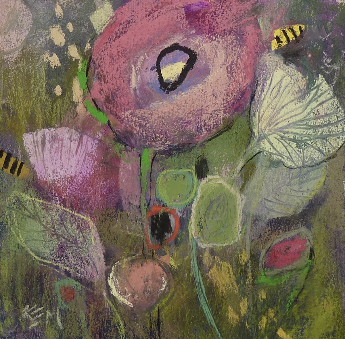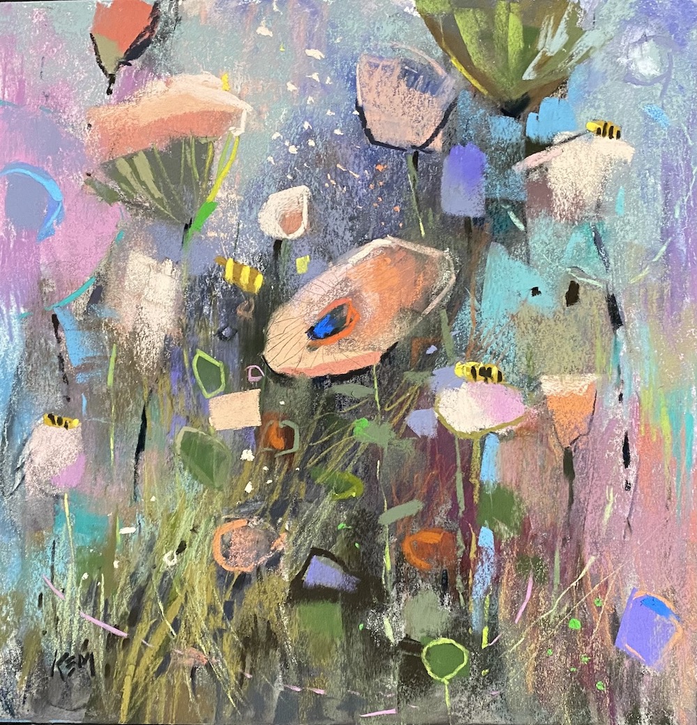 I love Karen’s new abstracted flower paintings. I have learned so much from her through the years such as how to paint grasses and lead the eye around the painting . I have observed her love of sometimes adding bees around her flowers. To now see these bees abstracted brings a HUGE smile to my face!