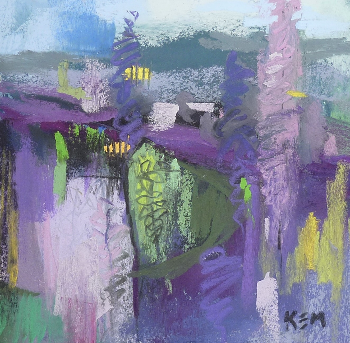 Sometimes I begin with a line drawing with black charcoal or black pastel and then begin building layers. The painting then goes through many layers of wet and dry layers. I put in a lot but end up covering it up to simplify and make a stronger composition. I am always thinking about how the viewer’s eye will move around the painting. I am also conscious of variation in my shapes, values, color, and mark making.