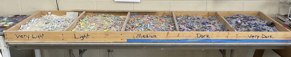 I sort my pastels by value, very light, light, medium, dark and very dark, I learned this from Susan Kuznitsky. This helps me since I paint by value not color. I used to keep them in Tupperware bins but recently I built my own value box with the 5 values. Each bin measures 18×28 in and is filled with cornmeal to keep them separated. Cornmeal also cleans the pastels. I purchased a 50lb bag through Amazon.