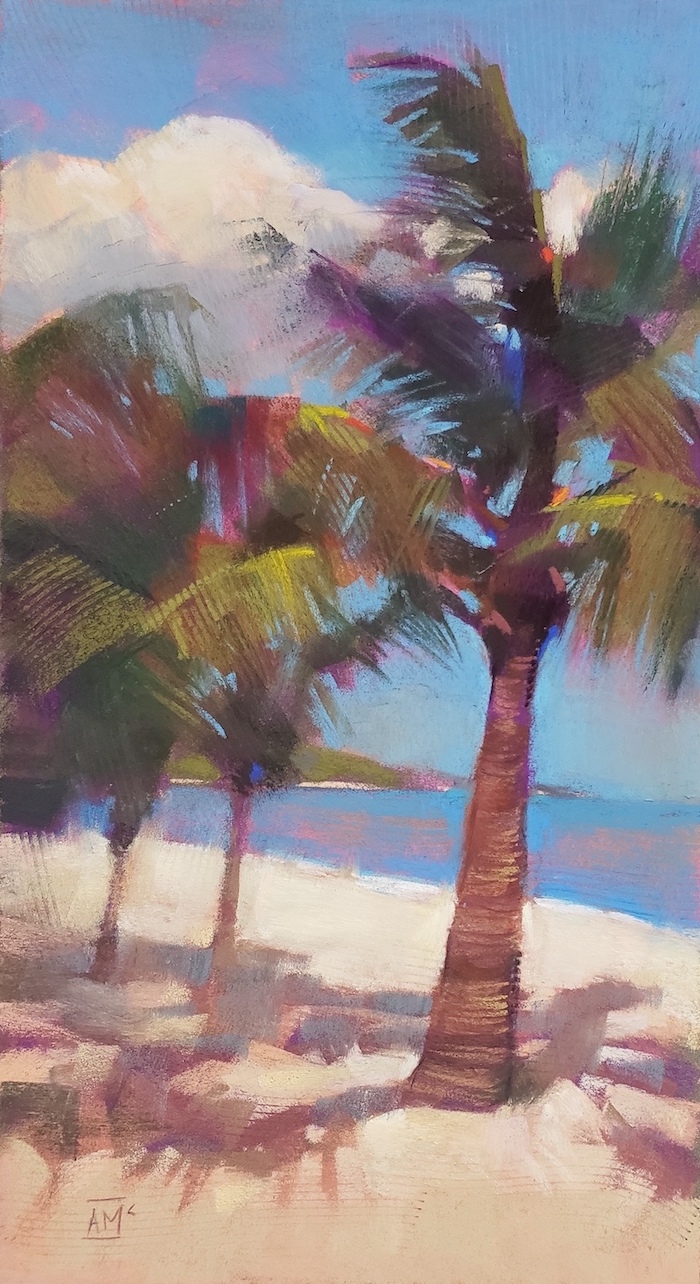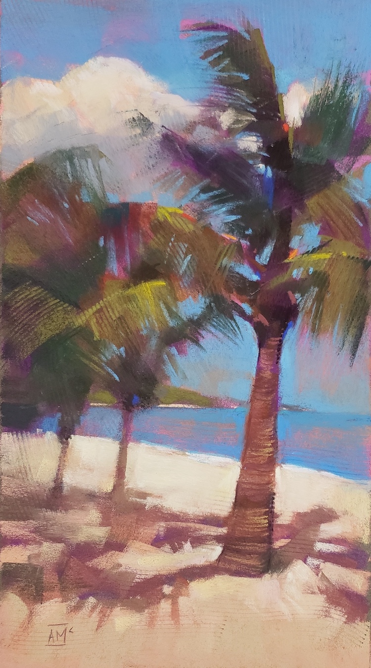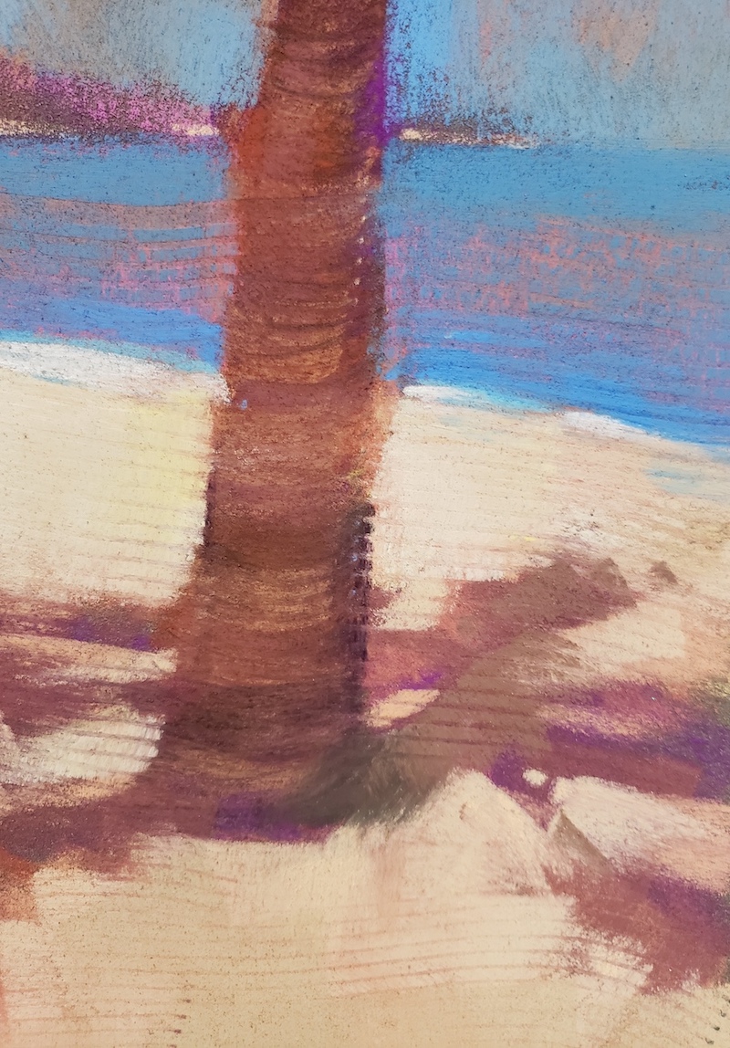 I continued with the beach, making sure I lightened the top and continued to darken the foreground section of the beach. I started to think about the smaller shapes and so I made some additions, adding more details in the background. I lightened up the palm trunks and added more to the leaves.