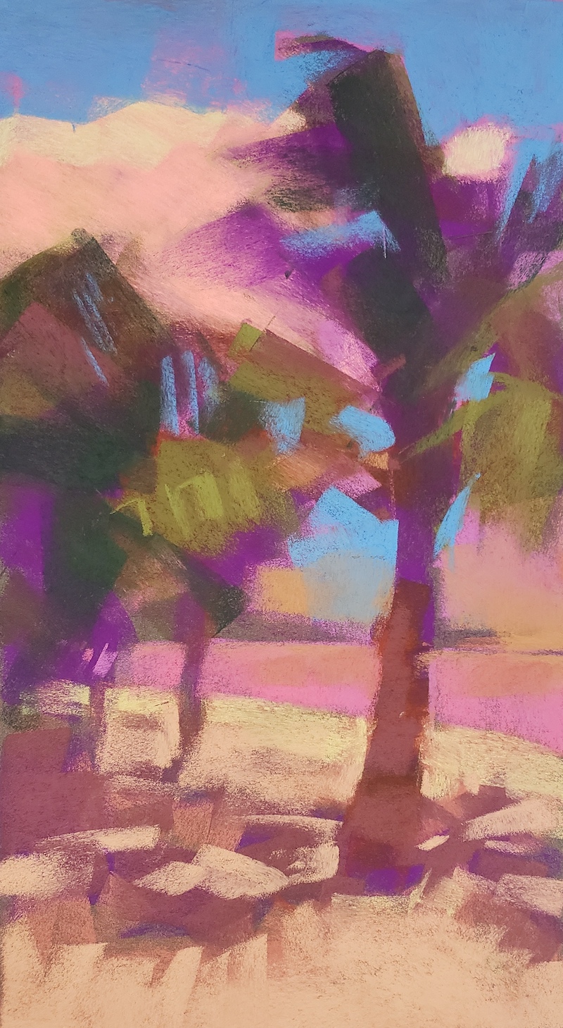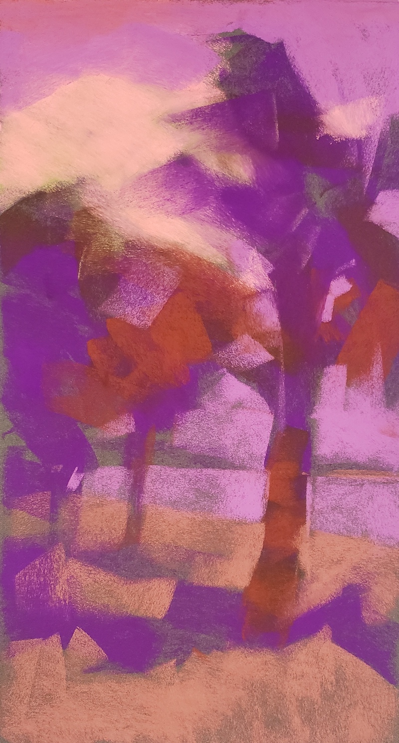 Here I used a broad Jack Richeson pastel stick in warm purple to block out my main shapes and the silhouettes of the trees.