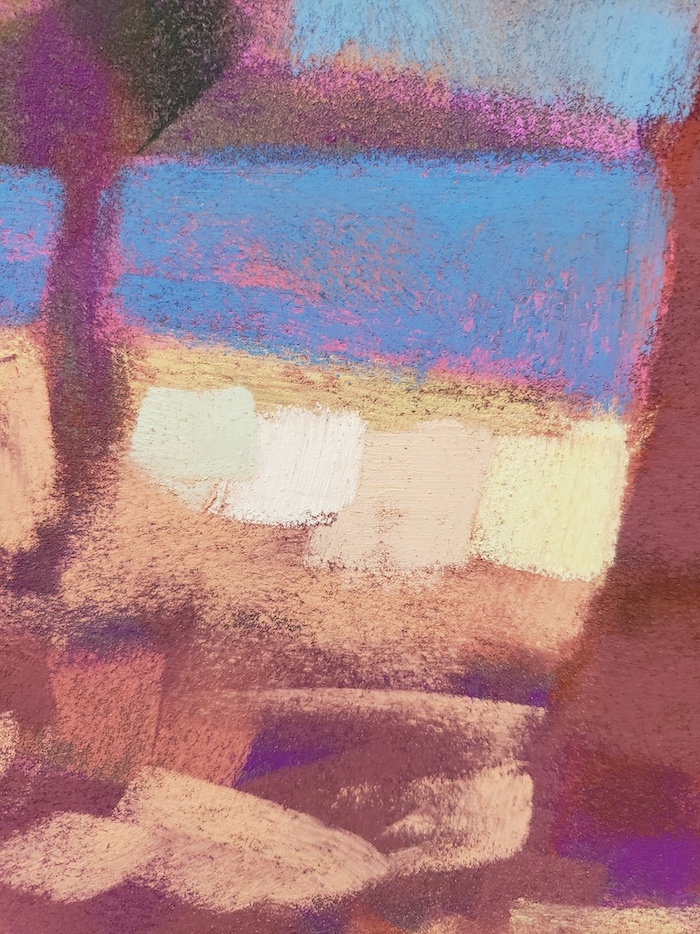 I’ve seen people using this method for painting in oils and I’ve been wondering if it would work with soft pastels. Face palm – why didn’t I just give it a go? I have done colour blocking with a loose sketch but not totally line free.