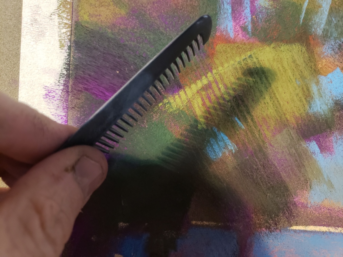 At this stage, to create more visual interest, I created textures. I use a comb and my rubber triangle to streak out the colours. I press hard and brush across my surface. I think about the direction of my strokes as the textures aid in guiding the viewer’s eye around the scene.